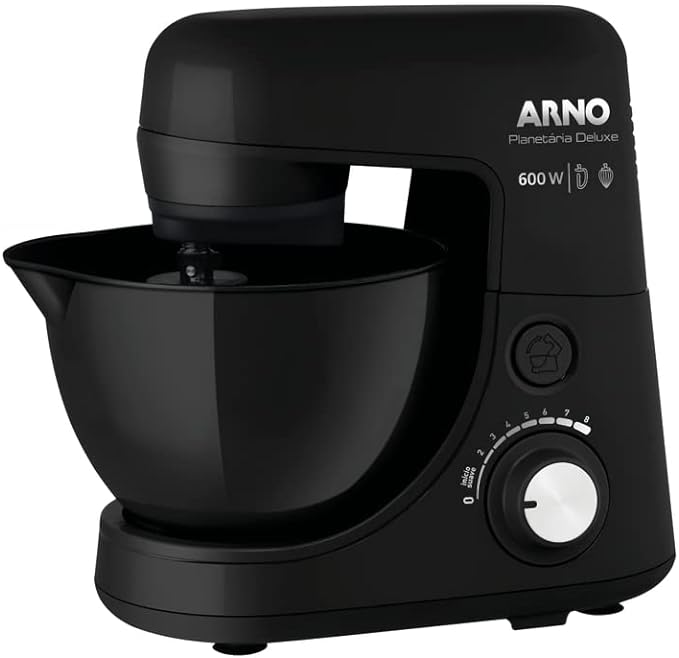 A batedeira da Arno tem uma potência de 600W e vem com 2 batedores. Ainda, conta com uma tigela de tamanho médio com cerca de 4,1L e possui resistência térmica podendo ser levado ao freezer ou micro-ondas. Bateria automática e com tigela removível.